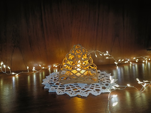 透け感のある木の様な置き飾りを作りました。細い藤で編んでいるので、かごよりも繊細です。(お取扱いに注意してください) 中にライトを入れるとお部屋の雰囲気も変わりとても綺麗です。 そのまま置いたり、上部分に紐を通して吊るしても楽しんでいただけると思います。 サイズ 縦 : 8.5cm 底 : 9cm(1辺の長さ)