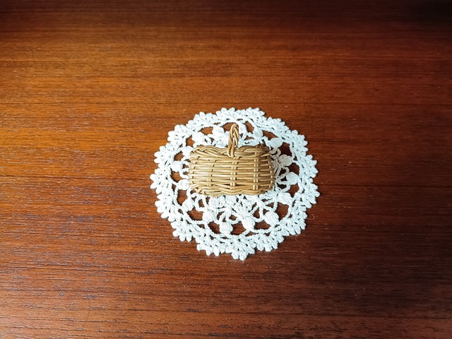ミニかごブローチです。 こちらは底が円になっています。 少し小さめですので、さりげなくおしゃれを楽しんでいただけます。 サイズ 縦(取っ手部分含む)4.2cmくらい 横 2.5cmくらいです。 珈琲染めした後にオイルコーティングしています。