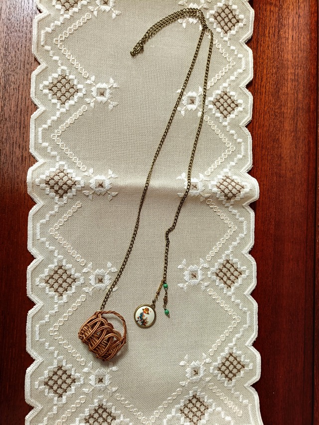 ミニかごとビーズのネックレスです。 そのまま下げていただいても、 3枚目の写真の様にクロスしてくるっとしてかごとビーズを好みの長さに整えてつけていただけます。 (ちょうちょ結びの最初の工程です) サイズ かご : 横 4cm 縦 4.3cm チェーンの長さ: 80cm くらいです。 かごは珈琲染めした後にクルミオイルでコーティングしています。