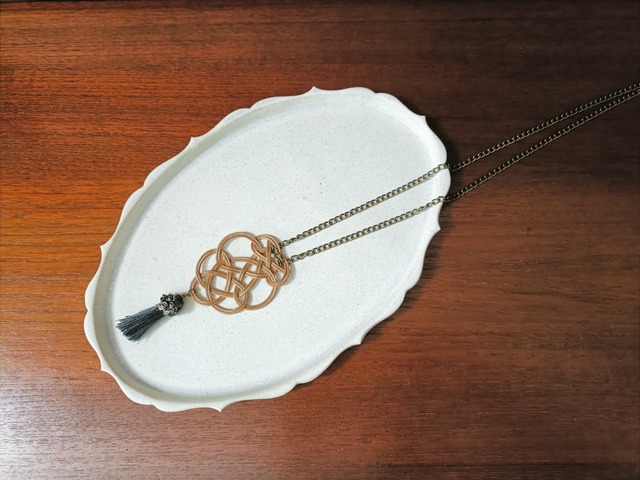 藤を編みこんでタッセルをつけました。 タッセルはベージュ系の色みで少し光沢があります。 珈琲染めをしたあとにオイルコーティングしています。 サイズ モチーフの直径:7.3cm タッセル:4.5cm チェーン:73cm くらいです。