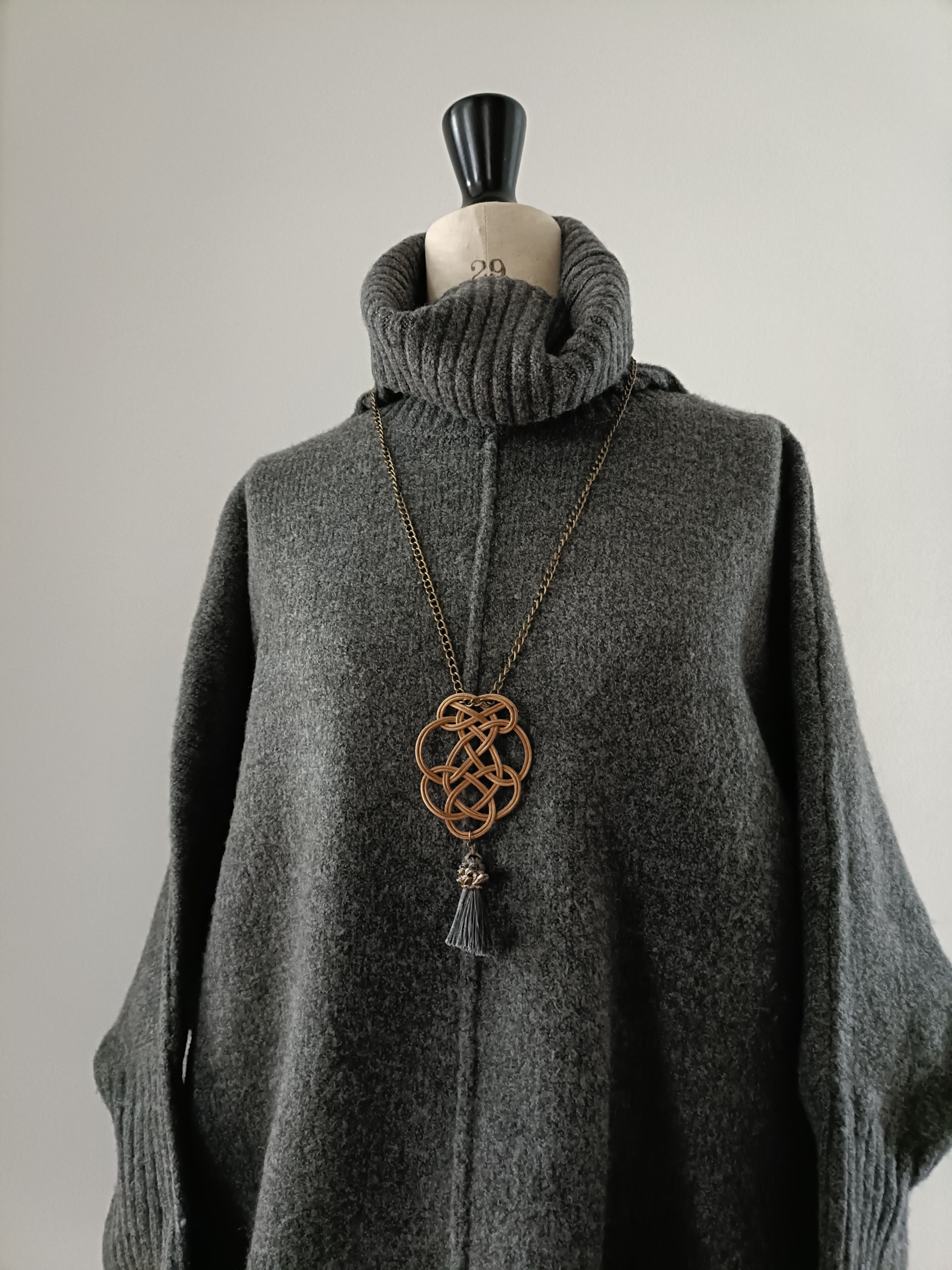 藤で編みこみモチーフを作りました。その下にタッセルがついています。