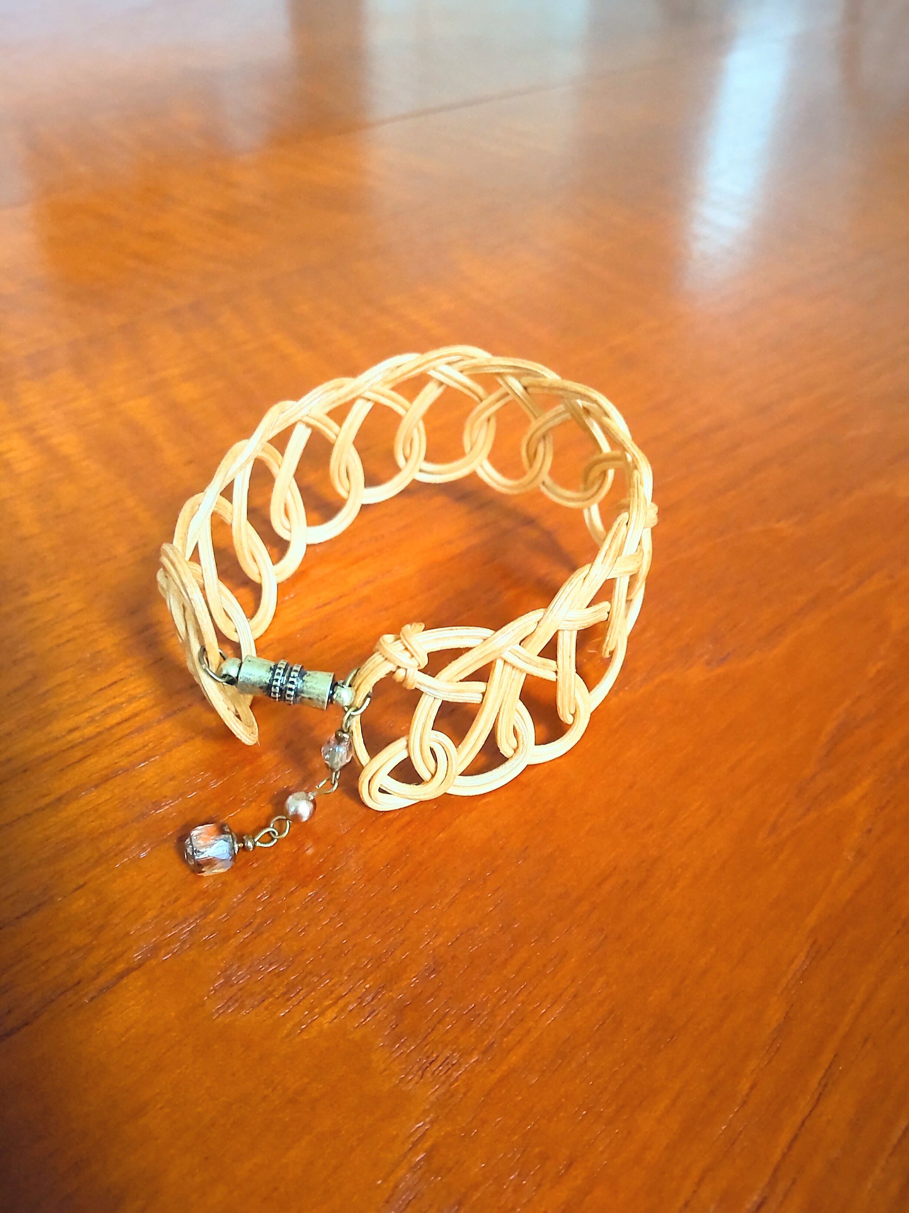 藤で編み、珈琲で染めてからオイルコーティングしています。